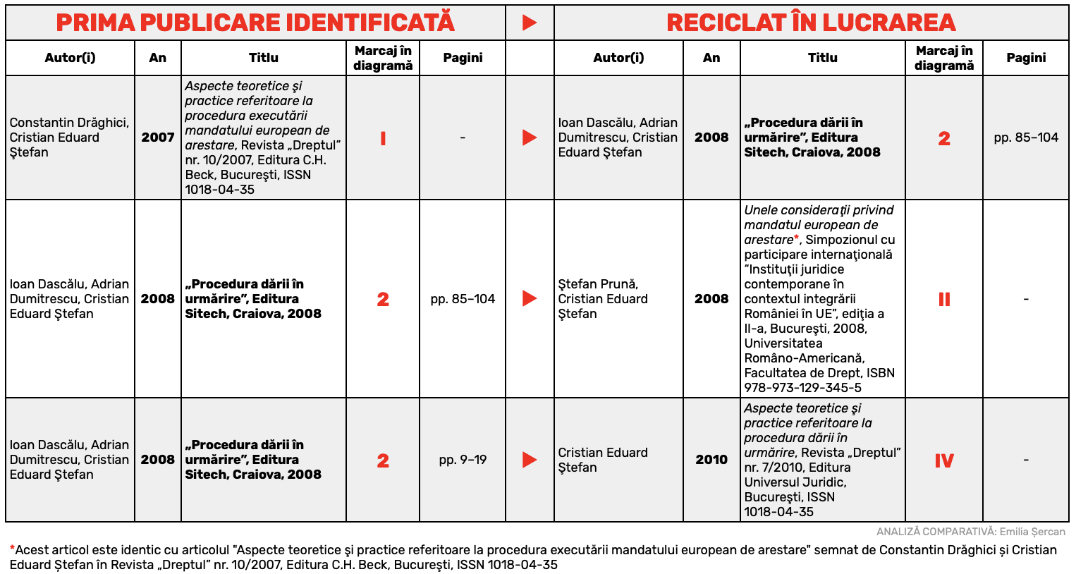 Singurul autor comun al celor două cărți este Cristian Eduard Ștefan, care poate fi acuzat – pentru aceste segmente din teza prin care și-a dobândit titlul de doctor, fundamentul carierei sale didactice – de autoplagiat.