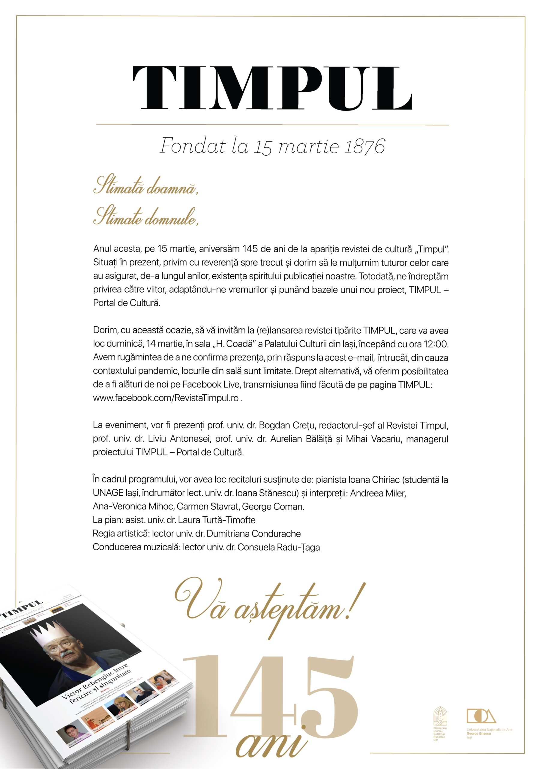 Anul acesta, pe 15 martie, aniversăm 145 de ani de la apariția revistei de cultură „Timpul”. Situați în prezent, privim cu reverență spre trecut și dorim să le mulțumim tuturor celor care au asigurat, de-a lungul anilor, existența spiritului publicației noastre. Totodată, ne îndreptăm privirea către viitor, adaptându-ne vremurilor și punând bazele unui nou proiect, TIMPUL – Portal de Cultură(www.revistatimpul.ro)