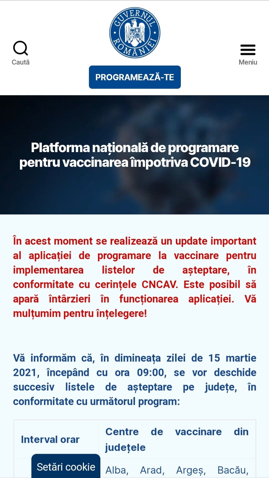 Cică de la 12 noaptea, adică de când se face luni gen, Guvernul vieții și al Seteseu și al tuturor comandanților Acțiunii tuturor vieților deschid platforma la programare la tot poporul. Ca atare, bineînțeles, platforma e căzută. Muci. Total. Cică fac un update important, mentenanță, optimizează aplicația :)))) și este posibil să apară întârzieri. :))) Au scris for proști. P ăștia îi ia prin surprindere și ziua de mâine, atât de bolovani sunt. Doamne ferește cât de praf sunt, conchide Sorina Ruxandra Matei. (Paul D.).