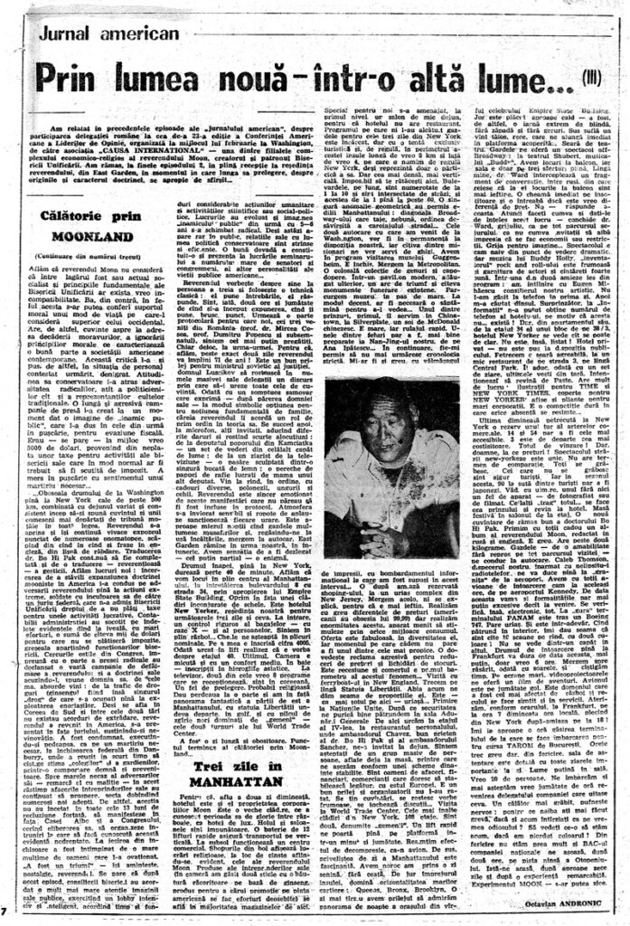 Ultima dimineaţă petrecută la New York o rezerv unui tur al arterelor comerciale. 14 si 34 par a fi cele mai accesibile. 5 este de departe cea mai costisitoare. Totul de vînzare! Dar, doamne, la ce preturi! Spectacolul străzii new-yorkeze este unic. Nu are termen de comparaţie. Toţi se grăbesc. Cei care nu se grăbesc sînt sigur turişti. Iar in sezonul acesta 90 la sută dintre turişti par a fi japonezi. Văd cu uimire unul fără nici un fel de aparat – de fotografiat sau de filmat. Ceilalţi „trag” totul… se face ora prînzului si revin la hotel. Masă festivă în salonul de la etaj. O noua cuvîntare de rămas bun a doctorului Bo Hi Pak. Primim cu toţii cadou un album al reverendului Moon, redactat în rusă şi engleză. E greu. Are peste două kilograme. Gazdele – de o amabilitate fără reproş pe tot parcursul vizitei – ne conduc la autocare. Caleb Thomson, dispecerul nostru, înarmat cu nelipsitu-i radiotelefon ne va duce pină la „graniţa” de la aeroport. Avem cu toţii avioane de întoarcere cam la aceleaşi ore de pe aeroportul Kennedy. De data aceasta vama si formalităţile par mai puţin excesive decît la venire. Se verifică. Insă. electronic, tot. La „gura“ terminalului PANAM este tras un Boeing 747. Pare uriaş. Şi este într-adevăr. Cînd pătrund in interior, îmi dau seama că sînt cîte 16 scaune pe rind cu două culoare. Nu se vede dintr-un capăt în altul. Drumul de întoarcere pînă la Frankfurt va dura de data aceasta, mai puţin, doar vreo 6 ore. Mergem spre răsărit, odată cu soarele, şi ciştigam timp. Pe ecrane mari, videoproiectoarele ne oferă un film de aventuri. Avionul este pe jumătate gol. Este domeniul care a fost cel mai afectat de război şi reculul se face simţit si in servicii. Aterizăm conform orarului, la Frankfurt pe la ora 7 dimineaţa ora locală, plecind din New York după-amiaza pe la 18! Îmi ia aproape o oră găsirea terminalului de la care se face îmbarcarea pentru cursa TAROM de Bucureşti. Orele trec greu, dar din fericire, sala de aşteptare este dotată cu toate ziarele importante la zi. Lume putină în sală. Vreo 20 de persoane. Ne îmbarcăm si mai aşteptăm vreo jumătate de oră revenirea delegatiei companiei care uitase ceva. Un călător mai grăbit, pufneşte nervos pentru ce naiba aţi mai făcut grevă dacă şi acum întîrziaţi ca pe vremea odiosului? Să vedeti ce-o să stăm acum dacă am pierdut culoarul! Din fericire nu stăm prea mult si BAC-ul companiei naţionale ne aşează, după două ore pe pista ninsă a Otopeniului. Iată-ne acasă, după aproape zece zile şi după o experienţă remarcabilă. Experimentul MOON – s-ar putea zice.