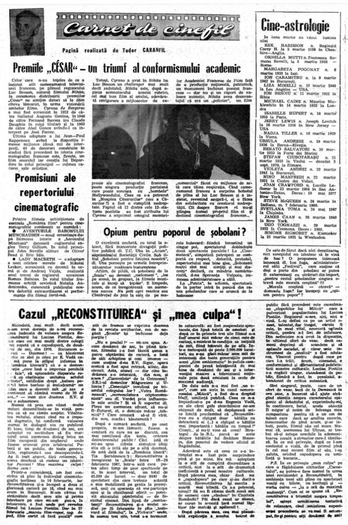 „Iată, deci, cum văd eu lucrurile: trebuie să proclamăm, de urgentă, sus şi tare, că republicile baltice, cele trei republici din Transcaucazia, cele patru din Asia Centrală (Turkmenistan, Uzbekistan, Kirkizia, Tadjikistan) şi de asemenea, Moldova, dacă se simte atrasă mai mult de România, deci aceste 11 republici, ei da! – sint destinate în mod absolut si irevocabil, să facă secesiune”. Profeţia semnificativă si prin conţinut; dar şi prin anvergura personalităţii autorului ei – Soljeniţin – este redată de „Phoenix“ într-un Serial alternativ, in care celebrul disident rus încearcă să răspundă lucid la întrebarea fundamentală a unei naţiuni aflate în epicentrul restructurărilor din lumea contemporană: „Cum să remodelăm Rusia noastră?”. „Ce se cuvine să numim Rusia? Astăzi si deopotrivă mîine (ceea ce este şi mai important). Cine simte astăzi că aparţine Rusiei de mîine? Si unde cred ruşii că se termină Rusia?“ In pagina a 4-a a aceluiaşi număr (8 an II harul lui Pavel Perfil: „În Voluntari, o nuntă s-a sfîrşit prost din cauza vioristului, băiat tînăr, ca la 25 de ani, român din Colentina. I-a căzut cu tronc domnişoara de onoare. O fi avut si fata mîncărimi dar şi vioristul era o frumuseţe de băiat; blugist brunet şi cu umor“ („strună de vioară, strună de amor“) • „Ţara arde şi… moşul se piaptănă” – sau umor cu puncte-puncte, în foiletonul din Viaţa Capitalei în care domnului Ion Plaţiu i se contestă cu vehementă oportunitatea propunerii unei întîlniri la Iaşi cu parlamentarii de peste Prut. În această privinţă politologul Radu Mogoşeanu gîndeşte: „Mi se pare că prea multă monedă se bate pe chestia cu Basarabia cînd noi avem atîta treabă de făcut în tara noastră” • Interesantă, semnificativă pentru spiritul de echilibru al publicaţiei, ancheta „Antena le aparţine” din Tinerama nr. 15 (1991). Oamenii televiziunii – „O adversitate declarată faţă de improvizaţia în care sînt siliţi să se descurce, o reticenţă faţă de teama imixtiunii politicului în treburile interne ale instituţiei pe care o slujesc… războindu-se între ei şi cu ei înşişi…”. Revista merită citită în întregime fiind, după opinia noastră, si una din cele mai bine realizate grafic, la această oră • Numărul 1 (an II) din Şansa, periodic de atitudine şi idei al mişcării neoliberale, punctează încă de pe prima pagină direcţiile Platformei acestui partid, care „se întemeiază pe concepte moderne”. Primul dintre acestea – „tehnologia de tip industrial”, concept care diferenţiază net mişcarea de celelalte care ar promova tehnologiile de tip agrar, spre exemplu. In aceeaşi publicaţie, în eseul „De unde începe sărăcia”, aflăm că „o să crească preţul leului”. Descoperitoarea acestui concept neoliberal – d-na Cristina Popescu • În Casa Comună „Vremea” – „Totuşi Iubirea” – dl. Bogdan Baltazar răspunde la articolul Cine este marele mahăr, dintr-un număr trecut al publicaţiei, detaliind cum s-au cheltuit „în mod justificat” 753 800 lei pentru reparaţia imobilului „în care locuieşte acum dl. prim-ministru în str. Gogol nr .2”. Am reţinut, între altele, că „intrucît mocheta lipită de podea cu care fusese casa datată a fost complet distrusă, s-a repus această mochetă, o mochetă inamovibilă, care aparţine casei, în valoare de 162 619 lei”. Cu siguranţă că dacă imobilul din str. Gogol n. 2 a citit explicaţia d-lui Baltazar s-a liniştit că mocheta inamovibilă în valoare de 162 619 lei îi aparţine lui si nu d-lui prim-ministru. În rest, nr. 10 (27 an II) mai conţine – poemul „Tragedia ţărănimii” de Adrian Păunescu, un „Dialog cu puterea” de Adrian Păunescu, poemul „Cum mor ţăranii” de Adrian Păunescu, articolul „Oamenii să fie băgaţi întîi în puşcărie, că după aceea li se găsesc şi capete de acuzare” semnat de Adrian Păunescu, interviul „Ceea ce ştiţi şi, mai ales, ceea ce nu ştiţi despre Gelu Voican Voiculescu”, de Adrian Păunescu. Poşta redacţiei de Adrian Păunescu. „Abjectul emisar al cîinilor morţi. Petre Mihai Băcanu fură eminent, citează calomnios şi contraatacă tîrîş”, de Adrian Păunescu, „Vatra Românească a instaurat ideea de caracter” de Adrian Păunescu, „Sport – Sub semnul terorii” de Adrian Păunescu, precum şi 21 de bancuri de Adrian Păunescu. În pagina 13, prima parte a unui volum de Memorii „Petreceri şi vacanţe cu Stalin” este semnat de Hruşciov • În Eveniment nr. 8 an II, interesantă de citit rămîne caseta cuprinzînd colegiul de redacţie: acad. Ştefan Milcu, Willian Edwards, Victor Bîrlădeanu, Mircea Lucescu, Teodor Popescu, Florin Panaitescu, Mircea Răceanu. Ghiţă Stanciu, Paul Tutungiu jr., Dan Vedea.
