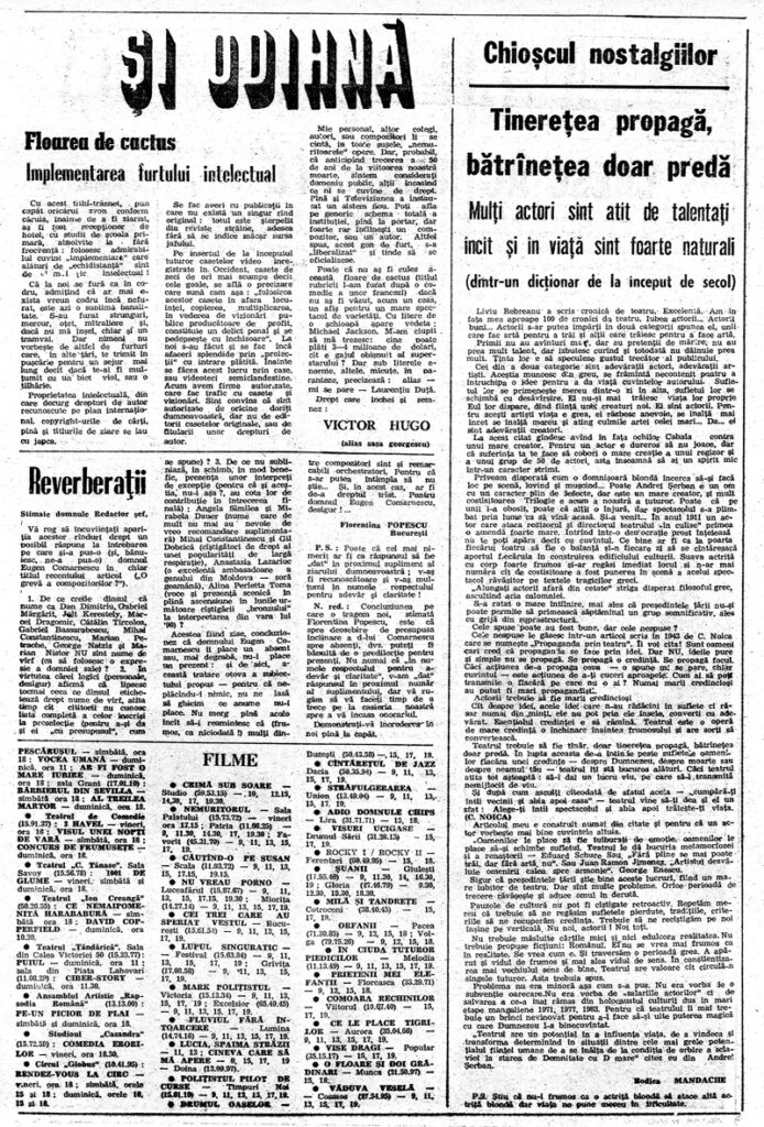 A sosit vremea să reclamăm absenţa… reclamelor culturale eficiente, de bun gust, pline de umor şi savoare. Teatrele tipăresc aceleaşi afişe neghioabe cu înşiruiri de nume şi cifre, cui îi e frică de fotografiile actorilor (actriţelor) de nu le expun altfel decît în chip de marcă poştală? Unde sint vitrinele speciale, unde sint „fluturaşii“ aruncaţi din elicopter? Copil fiind vedeam cum trec pe bulevardele Bucureştilor menajerii colosale: elefanţi, girafe, cai arăbeşti purtînd panourile gigante ale circurilor.