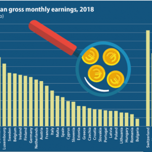 Câştigurile salariale brute lunare variază considerabil în rândul statelor din Uniunea Europeană. În 2018, câștigurile medii lunare au variat de la 4 057 EUR pe lună în Danemarca la 442 EUR în Bulgaria. România și Bulgaria aveau cele mai mici salarii medii din UE la nivelul anului 2018.