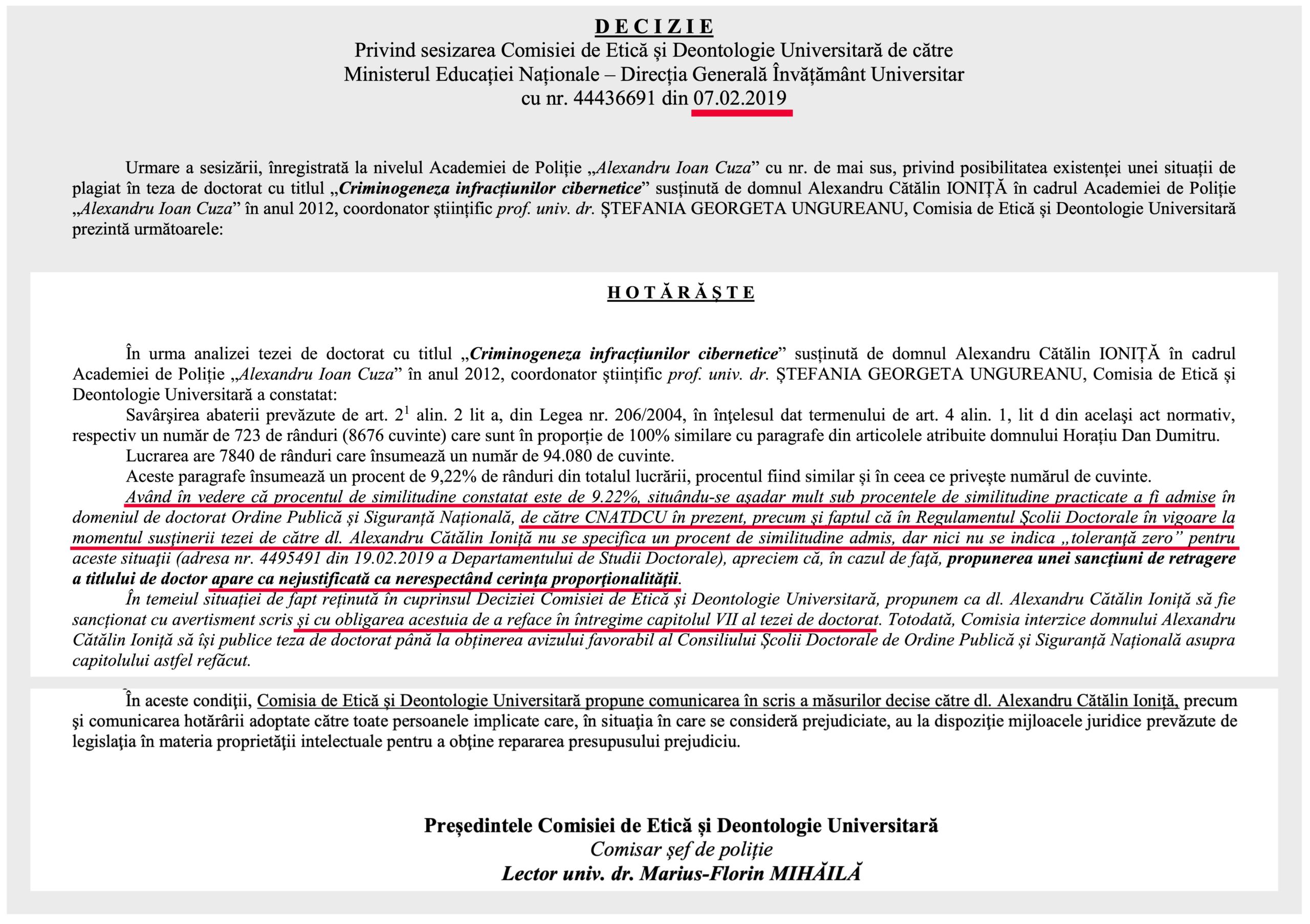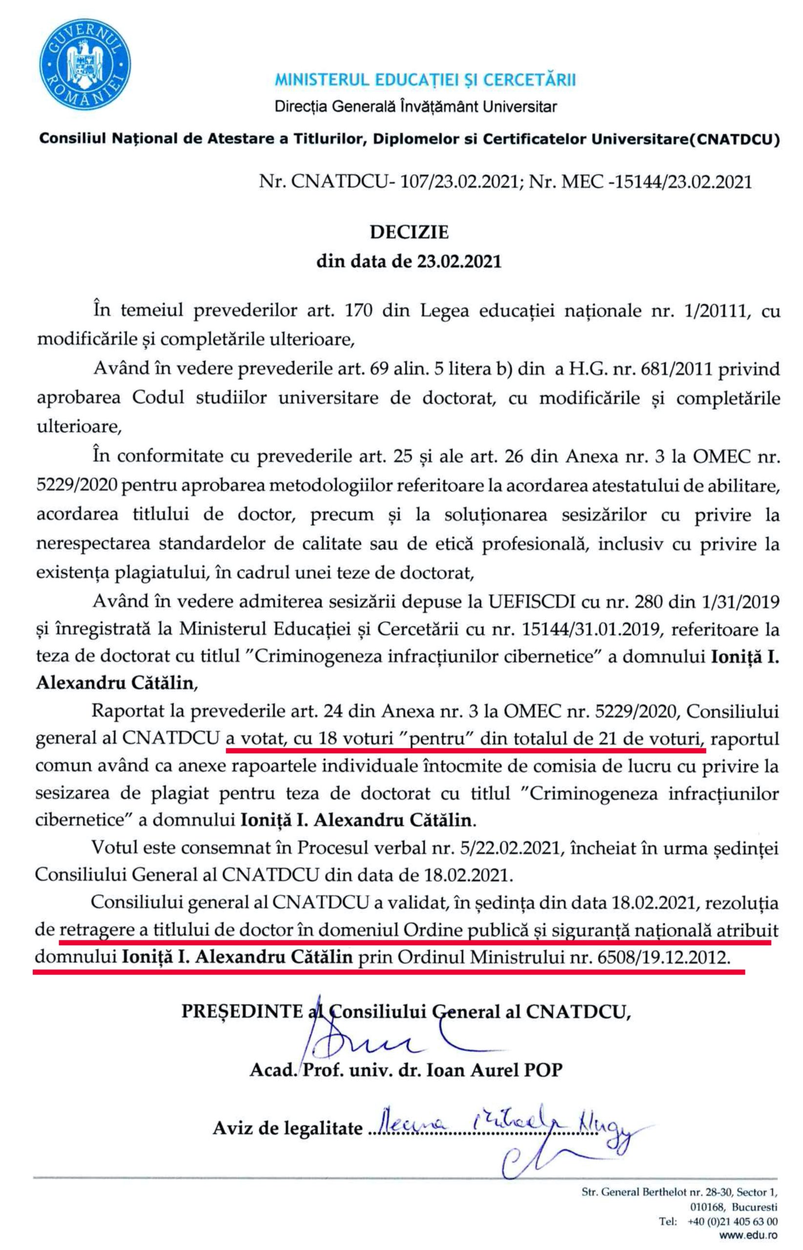 „Consiliul general al CNATDCU a validat […] rezoluția de retragere a titlului de doctor în domeniul Ordine publică și siguranță națională atribuit domnului Ioniță. I. Alexandru Cătălin prin Ordinul Ministrului nr. 6508/19.12.2012”.