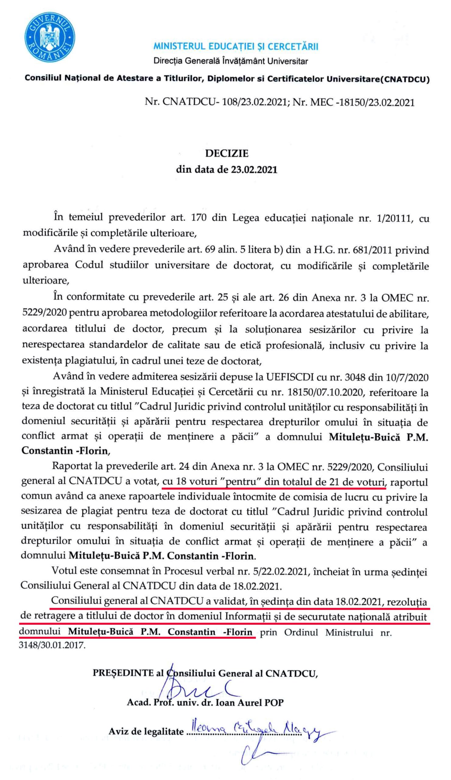 Decizia de retragere a titlului de doctor deținut de Constantin-Florin Mitulețu-Buică, președintele Autorității Electorale Permanente (AEP), a fost luată de Consiliul general al CNATDCU tot în data de 23 februarie 2021.