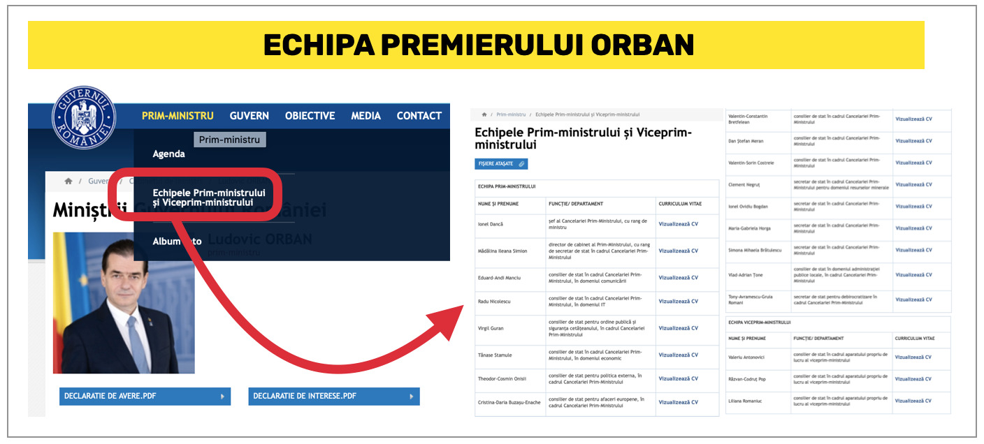 L-am contactat pe vicepremierul Dan Barna și l-am întrebat unde putem găsi date despre oamenii din echipa sa – nume, CV-uri și declarații de avere. Dan Barna a spus că aceste informații au fost depuse de cei din echipa sa la Secretariatul General al Guvernului și că probabil urmează să devină publice. Nu a putut preciza, însă, cum anume vor deveni publice.