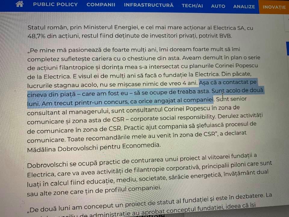 Reamintin ca, Mădălina Dobrovolschi, plecată în toamna anului trecut de la Realitatea Plus, s-a făcut consultant la stat. Corina Popescu, CEO-ul Electrica, a luat-o drept consultant pe Mădălina Dobrovolschi, fost jurnalist și fost purtător de cuvânt al președintelui Klaus Iohannis, scrie Economedia.ro.