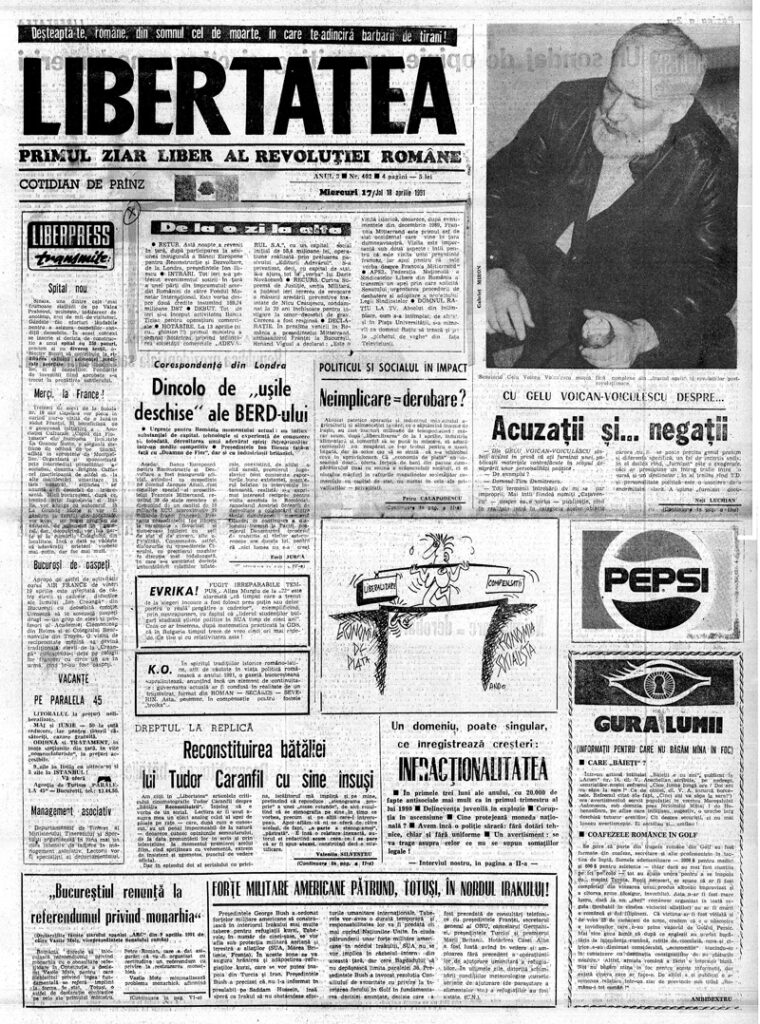 Ziarul Libertatea din 17 aprilie 1991, pag. 1-a ▼ Click pe imagine pentru mărire