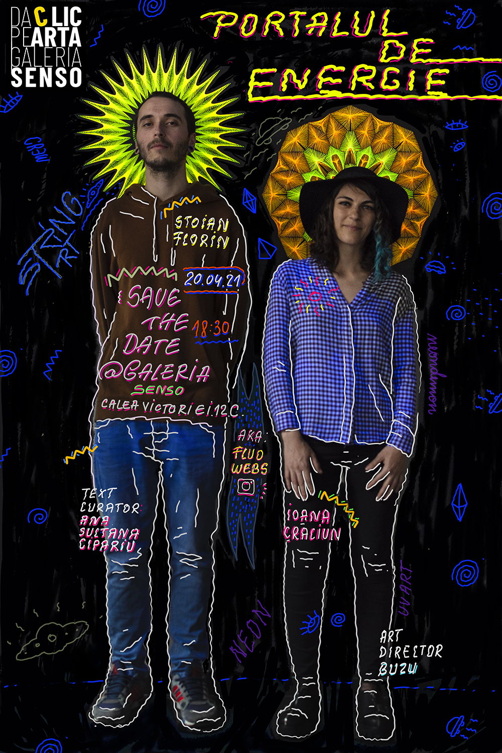 Marţi, 20 aprilie 2021, începând cu ora 18:30 vă aşteptăm la Galeria Senso, la deschiderea expoziţiei de string art fluorescent „Portalul de energie”, a duoului artistic Fluo Webs (Ioana Crăciun și Florin Stoian). Galeria Senso este situată pe Calea Victoriei nr.12C (colţ cu strada Lipscani), parter și etajul 1. „Portalul de energie” face parte din programul de evenimente propus de Ana Ștefania Andronic (BUZU), director artistic al spațiului expozițional.