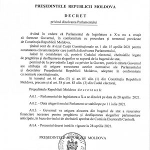 Președinta Republicii Moldova, Maia Sandu, a dizolvat miercuri Parlamentul de la Chișinău, prin decret prezidențial. Aceasta a transmis că vor avea loc alegeri pe 11 iulie, pentru a putea forma un nou guvern.