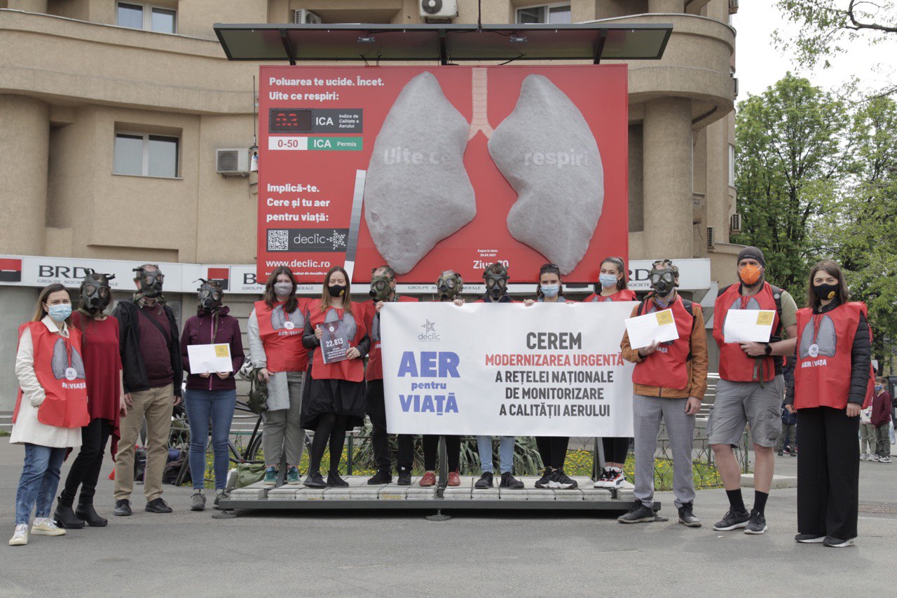 • Acţiunea a avut loc în cadrul campaniei „Aer pentru viaţă!”, în care 22.600 de membri Declic cer Ministerului Mediului modernizarea reţelei de monitorizare a calităţii aerului şi transmiterea datelor în timp real către Agenţia Europeană de Mediu.