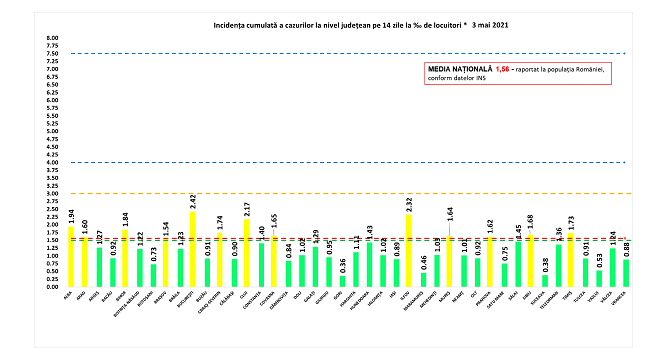 De asemenea, 29 de judeţe se află în zona verde (sub 1,5 cazuri la mia de locuitori), cele mai mici rate de infectare cu SARS-CoV-2 înregistrându-se în Suceava – 0,38, Gorj – 0,36 şi Maramureş – 0,46.