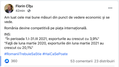 Vai vai! Un premier a uitat sa citeasca un comunicat pana la capat. Facand asta, pleaca de la premise eronate și ajunge la concluzii gresite. Si-a crescut Romania competitivitatea? Nu, si-a diminuat-o. Au functionat politicile economice de supra-indatorare in pandemie? Da, dar pentru stimularea economiilor din alte state si pentru pastrarea locurilor de munca acolo, nu aici. Cand importurile ti se majoreaza cu un ritm dublu fata de exporturi, e clar ca problemele le adancesti si nu le nivelezi, dezvaluie analistul Radu Teodor Soviani.