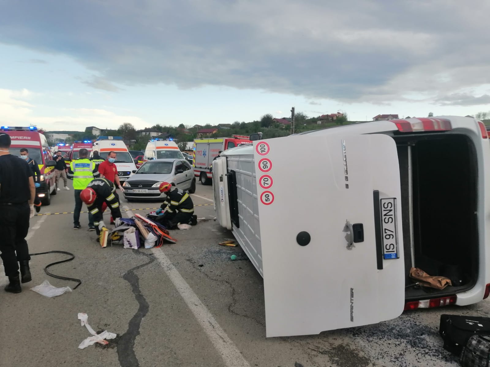 Accidentul rutier a avut loc în județul Iași, în localitatea Vânători, în cursul zilei de sâmbătă, 15 mai. În urma impactului dintre un autotren și un microbuz, 13 persoane, din cele 17 implicate în incident, au ajuns la spital.