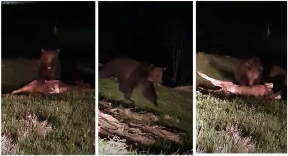 Un bărbat din județul Suceava a surprins un urs în timp ce îi mânca un vițel. Proprietarul animalului susține că ursul nu părea deloc speriat de prezența oamenilor și zgomotele făcute de aceștia.