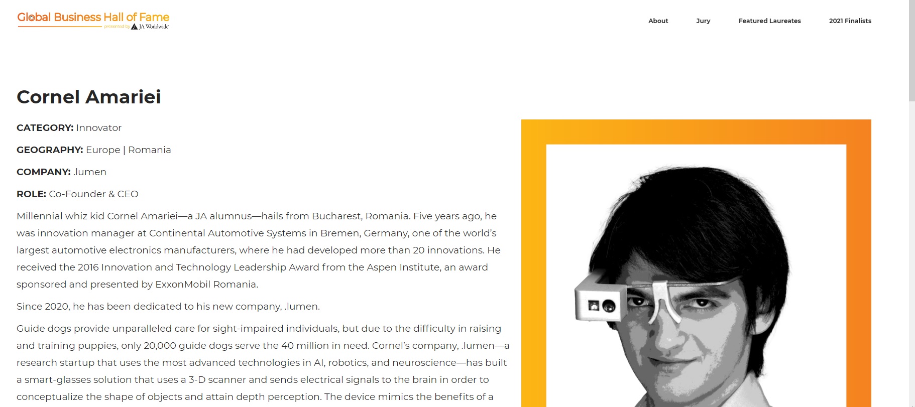 Românul Cornel Amariei, fondator al companiei .lumen, este unul dintre cei cinci finaliști ai programului Global Business Hall of Fame by JA Wordlwide. Numit recent de Forbes drept unul dintre cei mai influenți europeni sub 30 de ani și unul dintre „10 tineri remarcabili ai lumii”, tânărul antreprenor a inventat ochelarii digitali care înlocuiesc câinii însoțitori pentru persoane cu deficiențe de vedere.