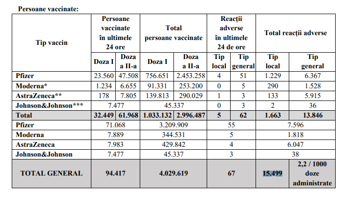 94.417  de persoane au fost vaccinate în ultimele 24 de ore. Au fost raportate 67 de reacţii adverse, a anunţat Comitetul Naţional de Coordonare a Activităţii privind Vaccinarea împotriva Covid-19 (CNCAV). Dintre cele 94.417 de persoane vaccinate în ultimele 24 de ore,  32.449 au primit prima doză de vaccin, iar  a doua doză 61.968 de persoane.