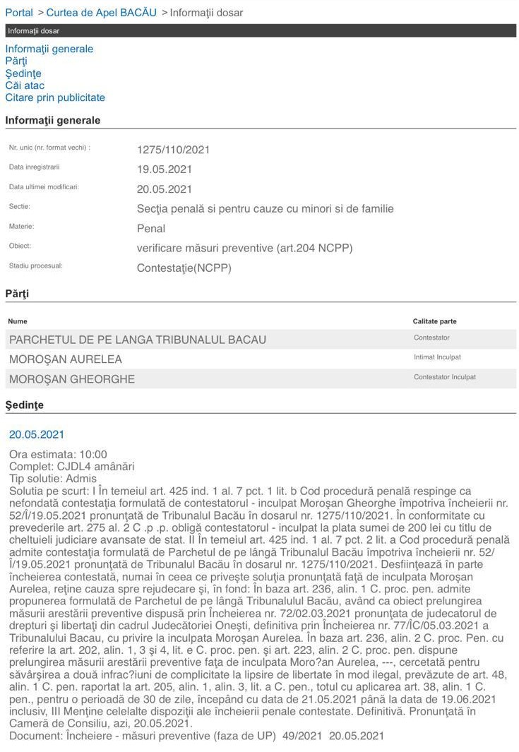 ”Dispune prelungirea măsurii arestării preventive față de inculpata Moroșan Aurelea – cercetată pentru săvârșirea a două infracțiuni de complicitate la lipsire de libertate în mod ilegal (…) pentru o perioadă de 30 de zile începând cu data de 21.05.2021 până la 19.06.2021, inclusiv. (…) Definitivă”, se menționează în soluția dată de Curtea de Apel Bacău.