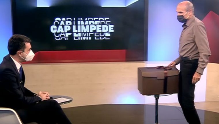 ”Am primit această cutie aici, la recepția Digi24, mi-au zis fetele de la recepție – «domnule Popescu aveți chestia asta». Am scuturat din cap, am ridicat-o, nu e ușoară. Cântărește ceva și am deschis-o să văd despre ce e vorba. Mai întâi vedeți ce scrie aici, scrie «domnului Cristian Tudor Popescu, analist politic, Digi24». Și acum, ce găsim în cutie… Găsim, carevasăzică, Henriete French trufes. Henriete. Cantuci con mandorle almond biscoti. Așa. Ferero roșer. Bomboane foarte plăcute. D-asemenea, Mozart pralines. O ciocolată roasted hazelnut, excelence. Darc ciocolate cataniez. Lindor irezistibli smot extra darc. Tot ciocolate negre sau ce-or fi ele. Aici avem altceva, mouse de canard. Asta-i o rață, cum ar veni. Mouse de fouille de voilale, sunt pateuri. Avem și niște cafea, să creștem tonicitatea.