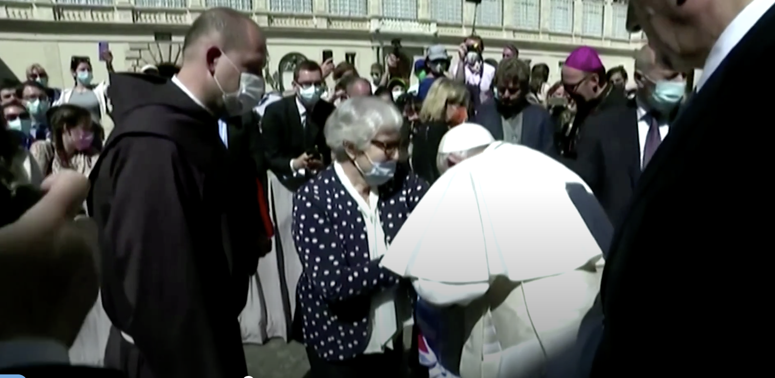 Papa l-a ascultat cu atenție pe un preot polonez care i-a spus povestea Lidiei Maksymowicz, în vârstă de 80 de ani, fostă deținută a lagărului de la Auschwitz. Femeia i-a arătat suveranului pontif numărul tatuat- 70072, acesta sărutându-l.