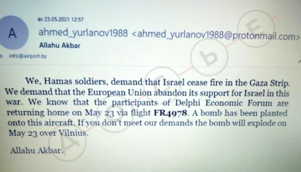 E-mailul a fost trimis la 24 de minute după ce autoritățile din Belarus au avertizat echipajul avionului că există o amenințare cu bomba