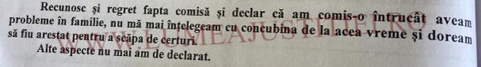 Recunosc si regret fapta comisa si declar ca am comis-o intrucat aveam probleme in familie, nu ma mai intelegeam cu concubina de la acea vreme si doream sa fiu arestat pentru a scapa de certuri. Alte aspecte nu mai am de declarat”.