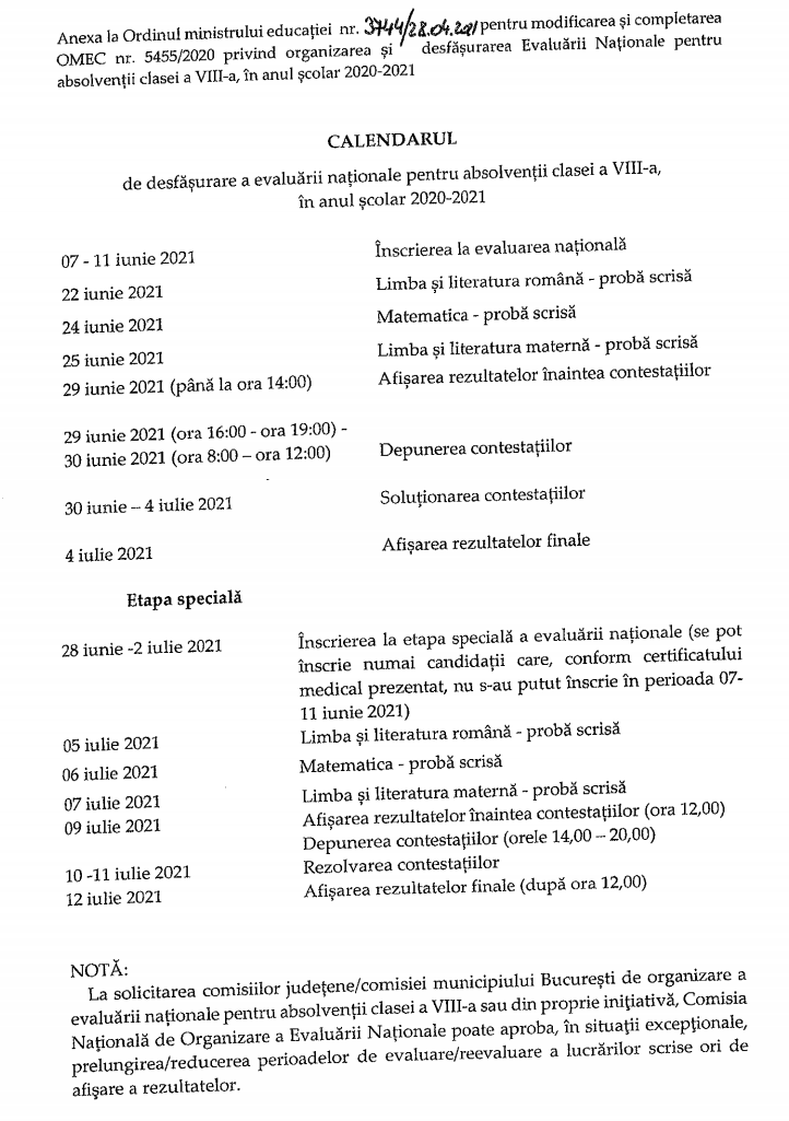 Calendar Evaluare Națională 2021