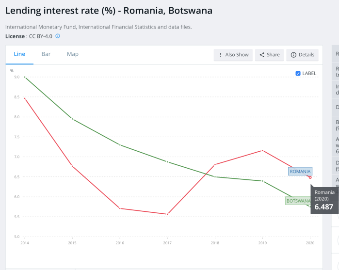 Datele FMI sunt extrem de clare: în anul de criză 2020, dobânzile la creditele din sistemul bancar din România au fost mai mari decât cele din Botswana: 6,487% în România față de 5,75% în Botswana: