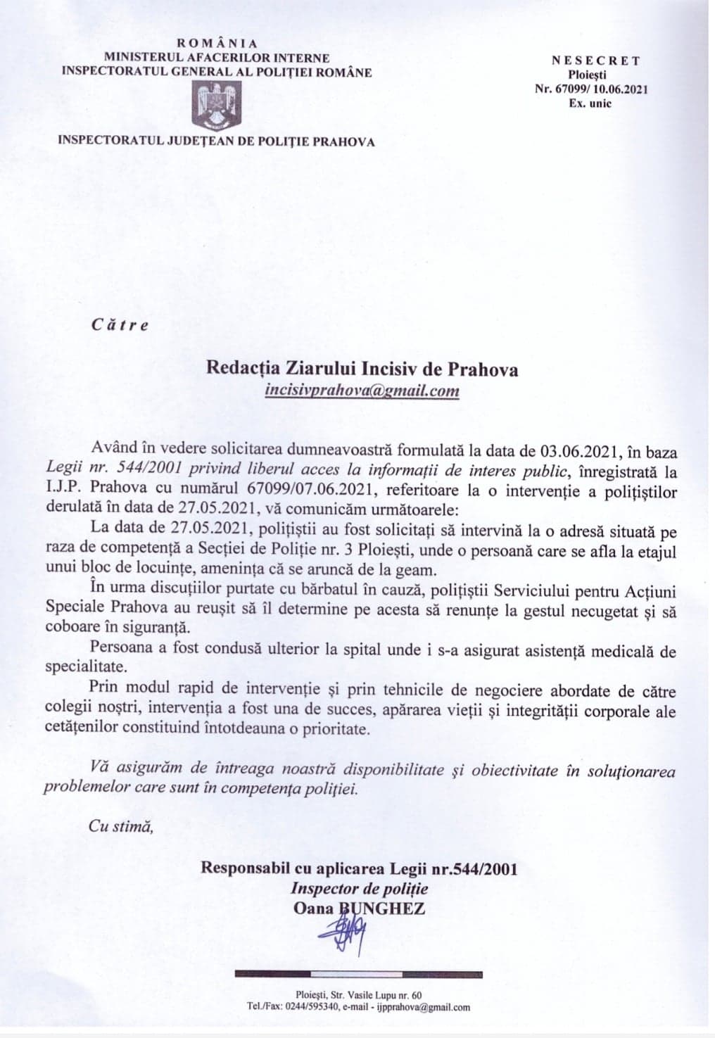 La data de 27.05.2021, politistii au fost solicitati sa intervina la o adresa situata pe raza de competenta a Sectiei de Politie nr 3 Ploiesti (condusa de comisarul-șef de poliție Adrian TĂTARU, un alt profesionist repus in functie de Comisarul şef de poliţie Marian IORGA), unde o persoana care se afla la etajul unui bloc de locuinte, ameninta ca se arunca de la geam.