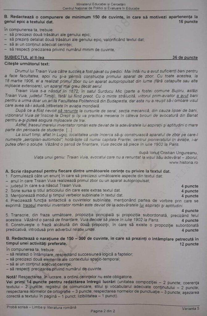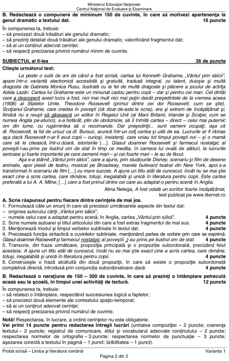 La Subiectul II B, candidații au avut de redactat o narațiune de 15-300 de cuvinte în care să prezinte o întâmplare petrecută în timpul unei activități preferate.