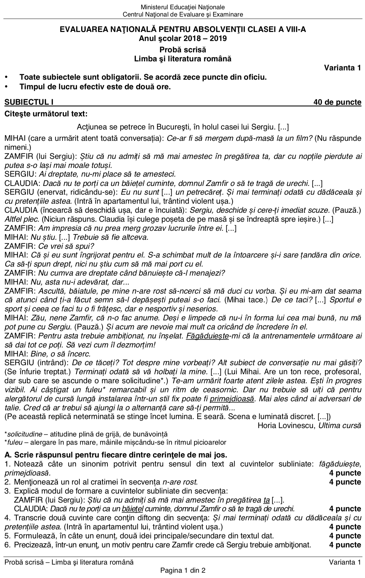 Vezi AICI un model de subiect pentru evaluarea națională 2021 la limba română și baremul de corectare aferent aici.