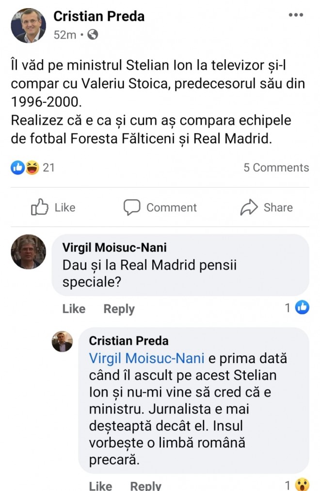 In viziunea fostului coleg, Stelian Ion „vorbeste o limba romana precara”, iar jurnalista „e mai desteapta decat el”. Si, poate cel mai umilitor, Preda a marturisit ca e prima data cand il asculta pe Ion vorbind. Grav, trist si foarte nasol.