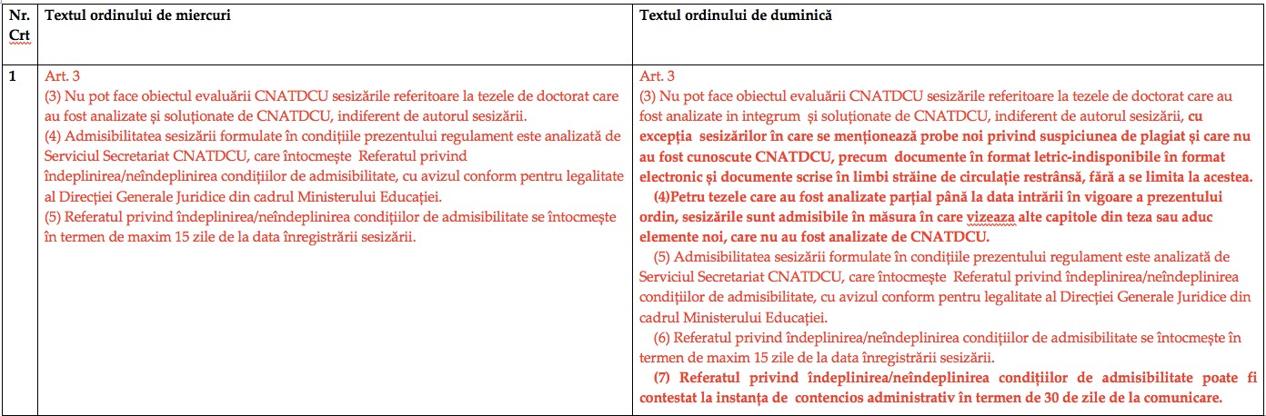 În varianta de miercuri se spunea că „Nu pot face obiectul evaluării CNATDCU sesizările referitoare la tezele de doctorat care au fost analizate și soluționate de CNATDCU”.