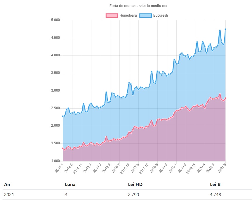 Salariul mediu net în Hunedoara este de 2.790 de lei, conform datelor Institutului Național de Sănătate Publică, valabile pentru luna martie. În județ erau, în mai 122.681 de pensionari, iar populația rezidentă după domiciliul, la 1 ianuarie 2021, era de 447.761 de persoane. 109.468 era, în martie, efectivul de salariați.