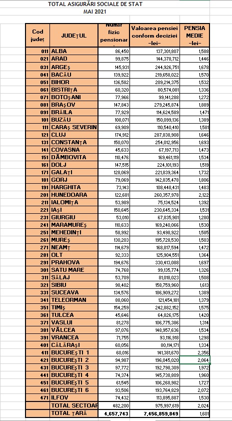 Spre comparație, la nivelul Bucureștiului, în aceeași lună, salariul mediu net era de 4.748 de lei. În toate sectoarele erau, în mai, 482.200 de pensionari în sistemul public, iar populația, la 1 ianuarie, de 2.158.169 de persoane. În martie erau 1.041.171 de slarariați în București, potrivit statisticilor INS.