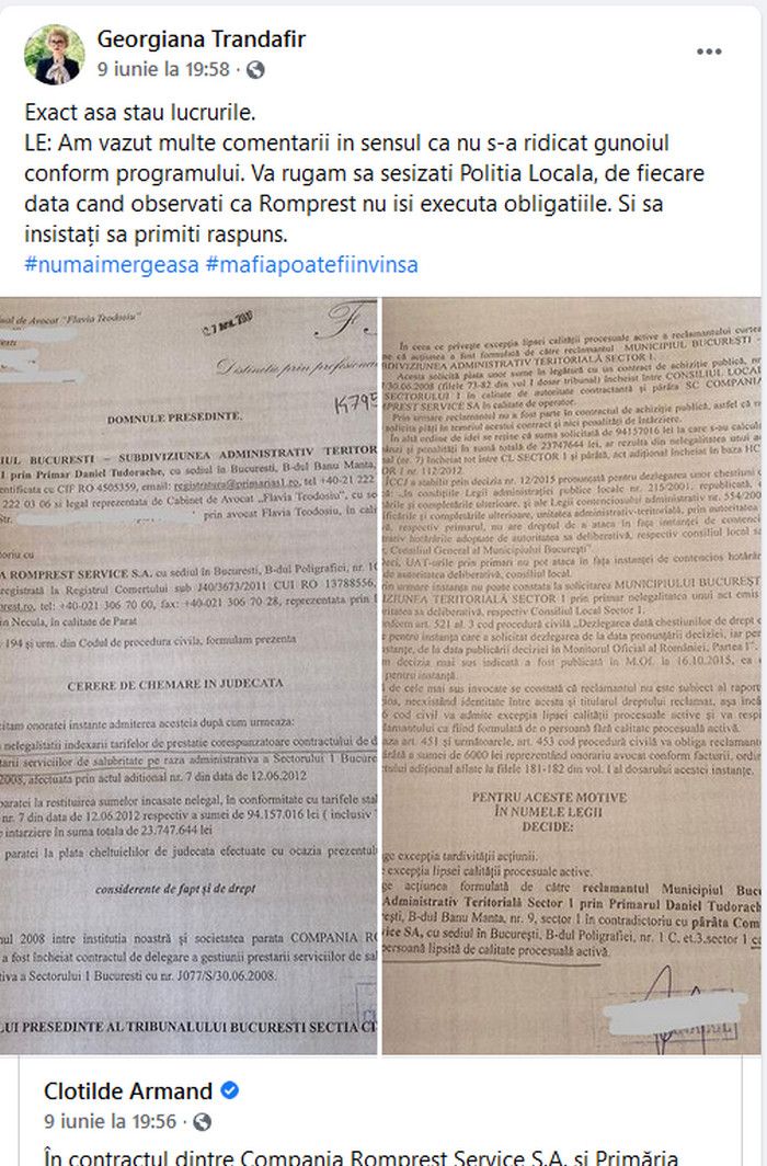 Bun contract a incheiat primarita Armand cu avocata Trandafir, avocata care, fie vorba intre noi, este si aparatoarea celebrei deja judecatoare excluse de doua ori din magistratura Camelia Bogdan. Incantata pentru indestularea din contractul de asistenta juridica incheiat inainte de Anul Nou cu Primaria Sectorului 1, avocata Trandafir vrea sa isi faca treaba cat mai bine si sa se asigure. Pentru asta se dezvolta chiar si pe Facebook, unde vedem ca posteaza cu o constanta elvetiana tot felul de “noutati” si “informatii” legate de contractul cu Romprest. Ba chiar doamna avocat face si invitatii catre cititorii sai, pe care ii indeamna sa sesizeze pe unde pot ei faptul ca Romprest nu strange gunoaiele din Sectorul 1. Multe dintre postarile avocatei Trandafir sunt chiar preluari de la primarita Armand. Toate, evident, pe tema Romprest. Nu vrem sa fim rautaciosi, insa nu putem sa nu intrebam: taxeaza pe contract si postarile pe Facebook?