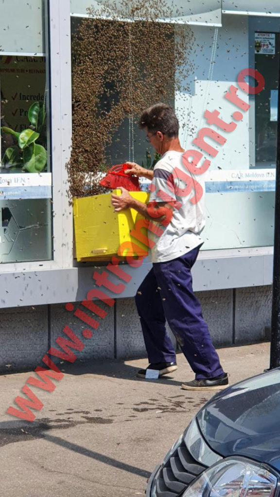Acesta ne-a mai spus ca s-a aciuat pe geamul CAR Moldova albinele dintr-un stup intreg. Se pare ca albinele au scapat cumva de sub control si si-au urmat matca(regina) pentru a o proteja, creand ad-hoc un „stup” pe geamul institutitiei financiare. Apicultorul chemat la fata locului ne-a mai spus ca albinele au plecat la roit si , probabil s-au ratacit, venind dupa matca, asa cum spuneam. Stupul in care colecta albinele ii apartine, dar nu se stie ale cui sunt acestea.. Poate ca vom afla, dar pana atunci este foarte interesant modul in care actioneaza aceste fiinte mici, pe baza informatiile genetice sau a constiintei colective care le guverneaza activitate.