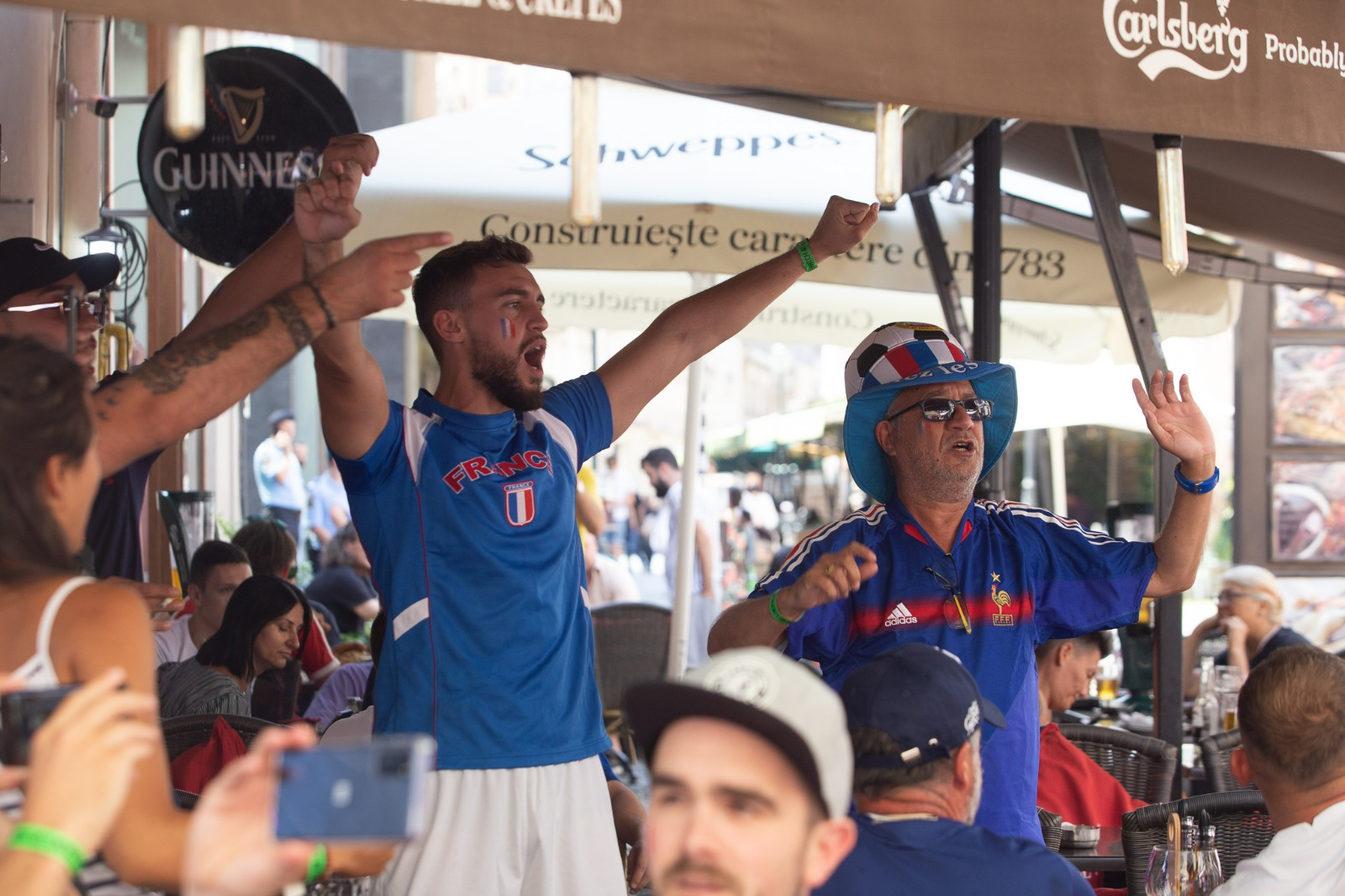 Suporterii francezi și elvețieni petrec, luni, în Centrul Vechi al Capitalei înaintea meciului celor două naționale din București. Franța și Elveția vor juca pe Arena Națională, în optimile EURO 2020, luni seară, de la ora 22.00. Acesta este ultimul meci organizat pe Arena Națională de la EURO 2020.