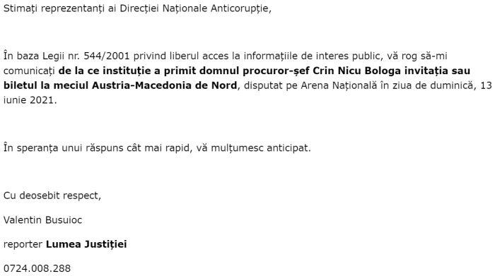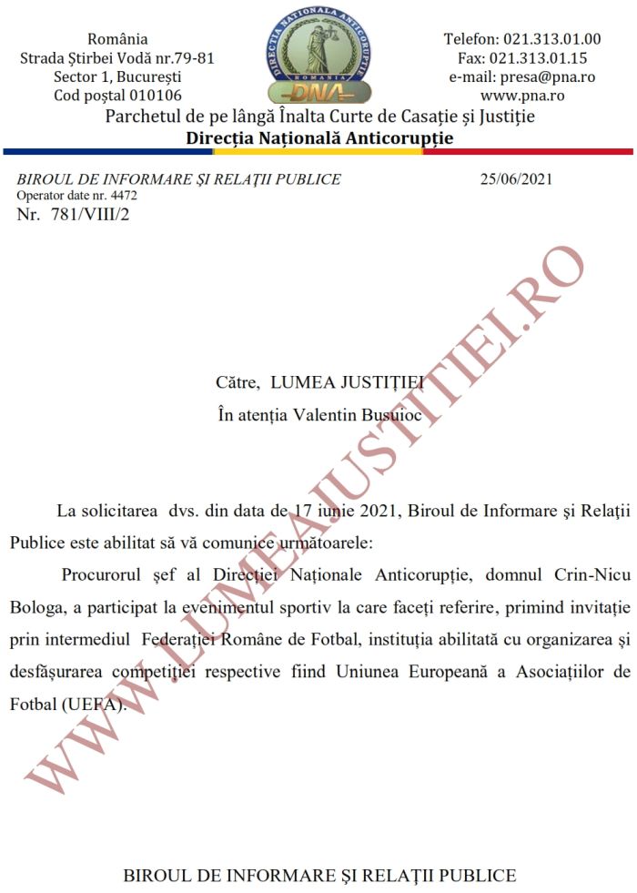 Si stiti ca Bologa si ceilalti lideri politici au stat la oficiala, in timp ce fotbalistii Generatiei de Aur au fost trimisi la Tribuna a II-a. Noi am fost curiosi sa aflam de la ce institutie a primit Bologa invitatia la meciul respectiv, asa ca am trimis o solicitare la DNA. La randul ei, Directia Nationala Anticoruptie a raspuns ca Nicu Bologa primise invitatia din partea Federatiei Romane de Fotbal (vezi facsimile). Asadar, sefii fotbalului se pun bine cu seful DNA, ca, deh, cine stie ce aduce viitorul. Caci altfel nu intelegem de ce sa ii dai invitatie la oficiala lui Crin Nicu Bologa, dar sa ii trimiti la Tribuna a II-a pe Gica Hagi si Gica Popescu, conchide cei de la Lumea Justitiei. (Irinel I.).
