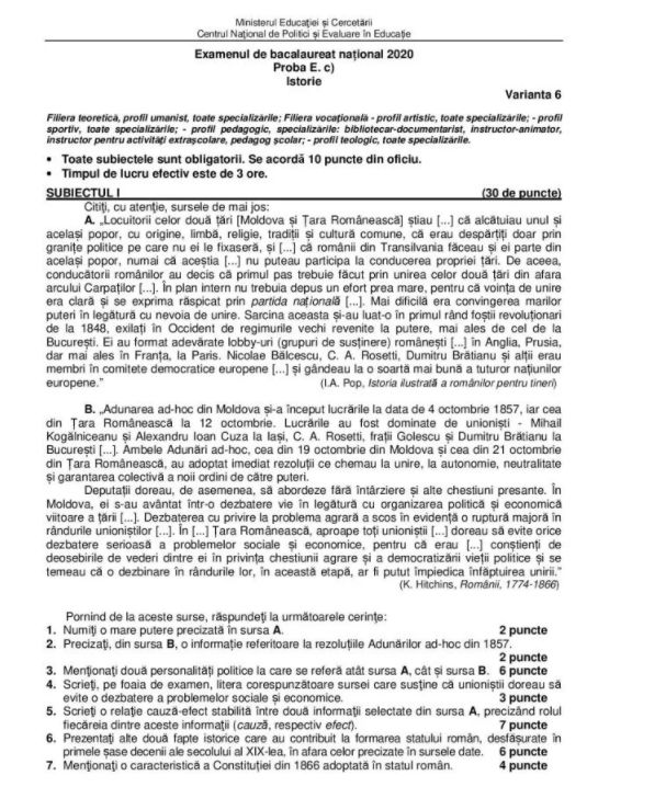 Subiecte la Istorie de la examenil de Bacalaureat 2020