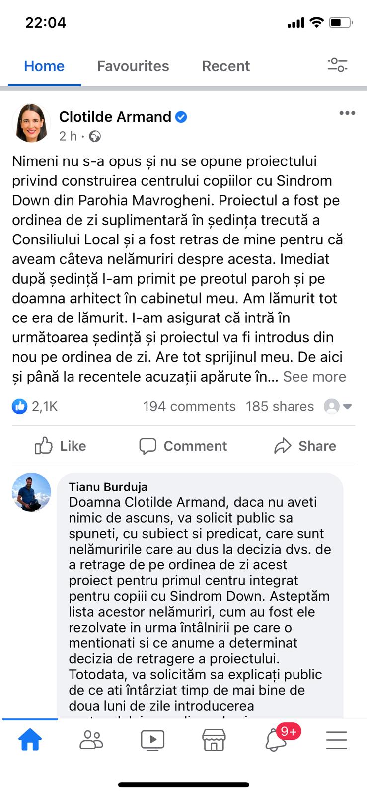 Doamna Clotilde Armand, dacă nu aveți nimic de ascuns, vă solicit public să spuneți, cu subiect si predicat, care sunt nelămuririle care au dus la decizia dumneavoastră de a retrage de pe ordinea de zi proiectul pentru primul centru integrat pentru copiii cu Sindrom Down, îi răspunde liderul PNL Sector 1, Sebastian Burduja primarului Sectorului 1 la mesajul pe Facebook scris de Clotilde Armand pe acest subiect.