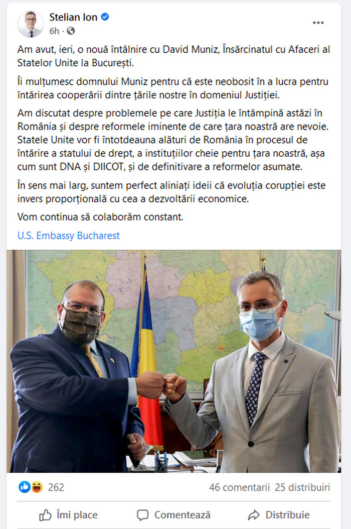 Stelica ar trebui sa o lase mai usor cu lugu-lugu pe langa insarcinatii astia straini ca ne-am cam saturat si noi, ca romani ce suntem, de ode si aprecieri, covoare rosii si palmute in fata oricarui purtator de steag strain. Spre exemplu, chiar astazi, Stelica Ion s-a trezit sa dea cu saru-mana pe Facebook functionarului de la ambasada SUA, David Muniz, insarcinat cu Afaceri al SUA la Bucuresti, pentru prilejul de a-i trece pragul si de a da pumnul cu el. In postarea sa, ministrul a gasit potrivit sa spuna fix ceea ce ii inspaimanta pe toti romanii, anume ca politicienii romani vorbesc cu strainii despre treburile noastre interne (mai cu seama Justitia). Si nu oricum, ci cu multumiri, caci Ion ii multumeste insarcinatului SUA pentru ca nu oboseste sa lucreze la cooperare in domeniul justitiei. Suntem convinsi ca nu cele enuntate au fost singurele teme de discutie, mai cu seama ca acelasi insarcinat s-a exprimat deja impotriva SIIJ. Buna treaba, Stelica! Noi zicem ca Stelian Ion inca ministru al Justitiei ar trebui mai degraba sa se preocupe de starea Justitiei reale, si nu de cea facuta de magistratii activisti. Spre exemplu, Stelica sa rezolve deficitul de personal din instante, generat de pensionari, sa gaseasca o modalitate de pastrare a SIIJ (singura unitate de parchet independenta, fara implicarea factorului politic) si nu sa militeze pentru desfiintarea ei doar de dragul doleantelor altor persoane interesate, sa gandeasca pe bune modalitati de eficientizare a activitatii instantelor, sa faca ceva cu penitenciarele si cu conditiile din inchisori, sa se ocupe atent ca hotararile CCR sa fie respectate pentru o mai corecta aplicare a legii, si cate altele...
