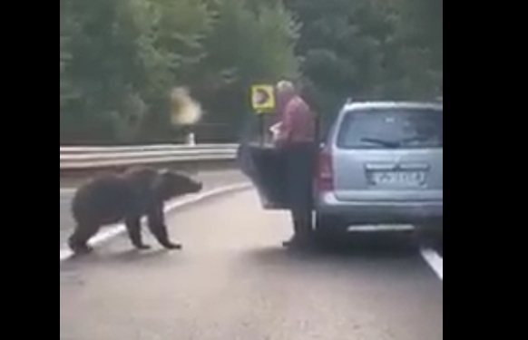 Bărbatul din fotografie a fost filmat când a oprit maşina pe marginea unui drum din judeţul Vrancea, a coborât şi a început să îi arunce mâncare unui urs flămând.