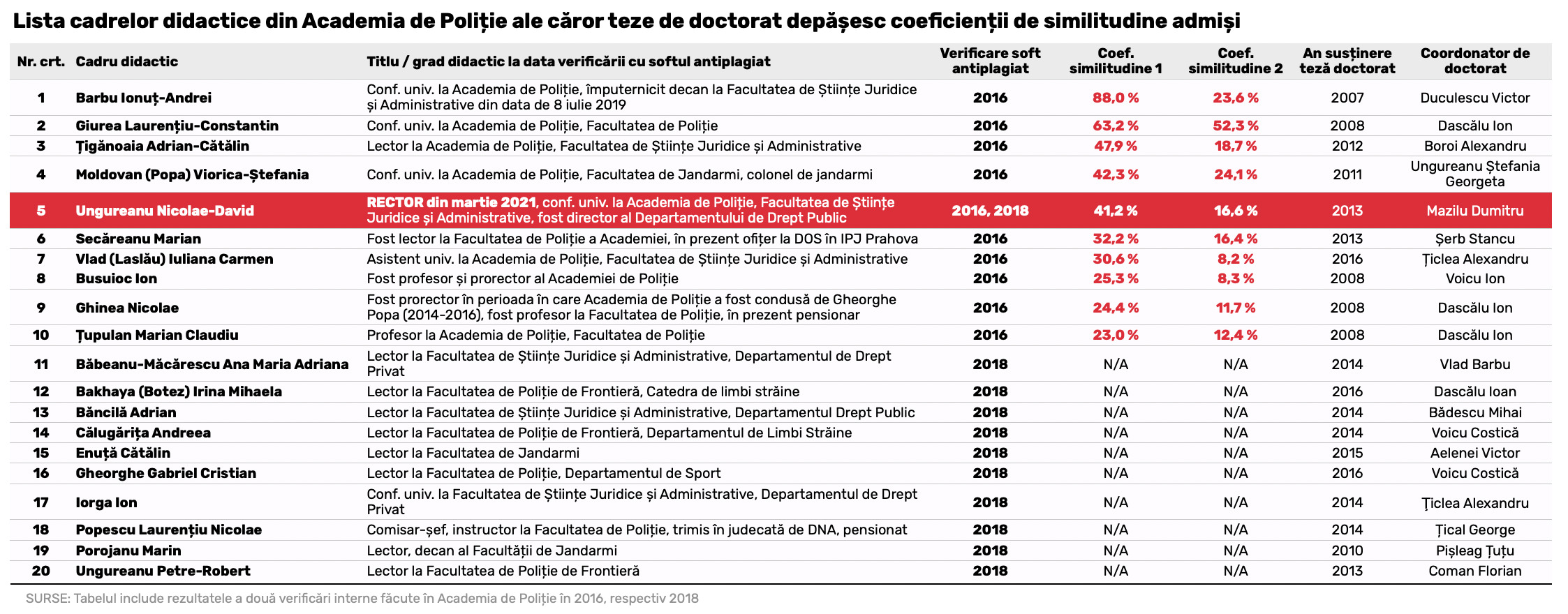 E drept că în cazul rectorului David Ungureanu nu există încă un verdict din partea CNATDCU pentru niciuna dintre cele două teze de doctorat ale acestuia, însă funcția de rector este cea mai vizibilă poziție dintr-o universitate, iar în cazul lui Ungureanu suspiciunea vizează nu una, ci ambele lucrări științifice ale acestuia, după cum am arătat în martie în investigația „Urgia la Academia de Poliție (XII): Un rector. Două doctorate. Două plagiate”.