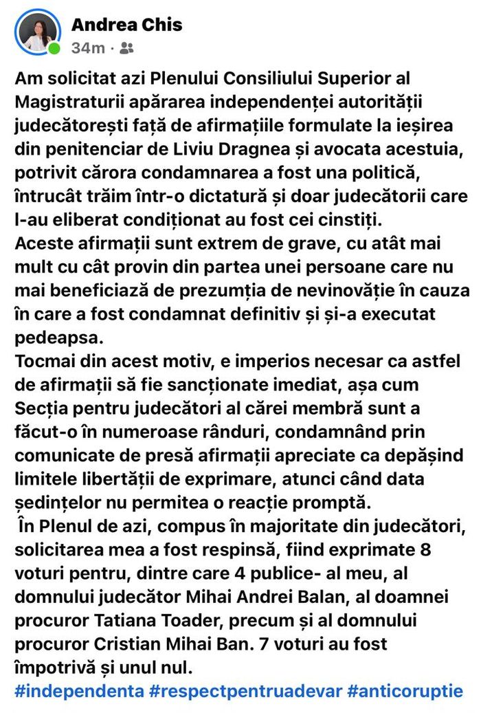 In Plenul de azi, compus in majoritate din judecatori, solicitarea mea a fost respinsa, fiind exprimate 8 voturi pentru, dintre care 4 publice – al meu, al domnului judecator Mihai Andrei Balan, al doamnei procuror Tatiana Toader, precum si al domnului procuror Cristian Mihai Ban. 7 voturi au fost impotriva si unul nul. #independenta #respectpentruadevar #anticoruptie”.
