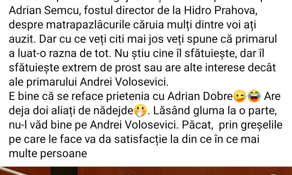 Mai repede decât mă așteptam, și o spun cu părere de rău, credibilitatea lui Andrei Volosevici se apropie de final. Din păcate, când te înconjori de personaje dubioase, abile, dar dubioase pentru opinia publică, riști să te afecteze direct. Scriam cu puțin timp în urmă despre mutarea pe care a facut-o primarul angajandu-și consilier personal … Continuă lectura Eugen Cristescu, președinte UAP: Mai repede decât mă așteptam, și o spun cu părere de rău, credibilitatea lui Andrei Volosevici se apropie de final