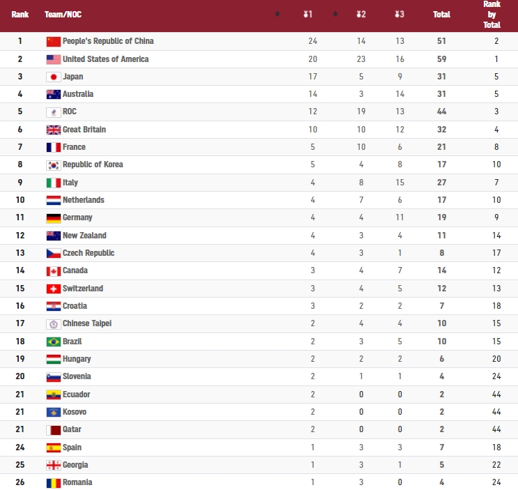 China are 24 de medalii de aur (14 de argint şi 13 de bronz), fiind urmată acum de SUA (20-23-16), iar Japonia a coborât pe locul al treilea (17-5-9) etc.