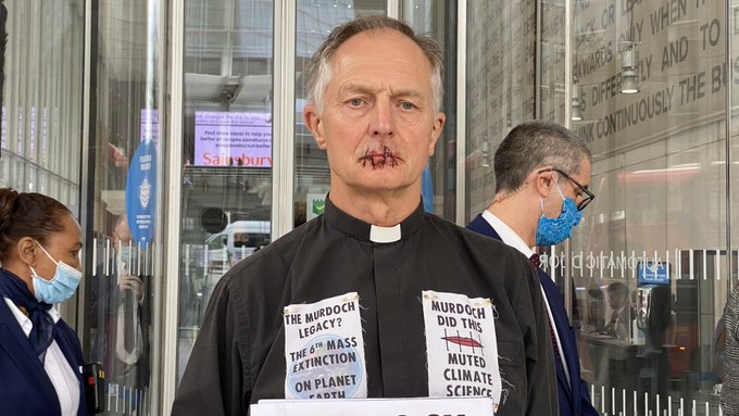 BREAKING: Revd Tim Hewes, 71, outside News Corp offices now: ‘I’ve sewn up my lips to demonstrate the terrible havoc Rupert Murdoch’s actions have reaped upon the world and to make this visible: climate science and truth has been muted, those who suffer are not being heard.’ pic.twitter.com/tu1yRjofju