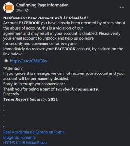 În continuare, aveți un exemplu de astfel de cont de Facebook care publică un post de ‘avertizare’ pentru paginile etichetate, cu amenințarea că activitatea paginii va fi suspendată, dacă nu se va ‘verifica identitatea’ prin accesarea unui link plasat strategic în textul postării.