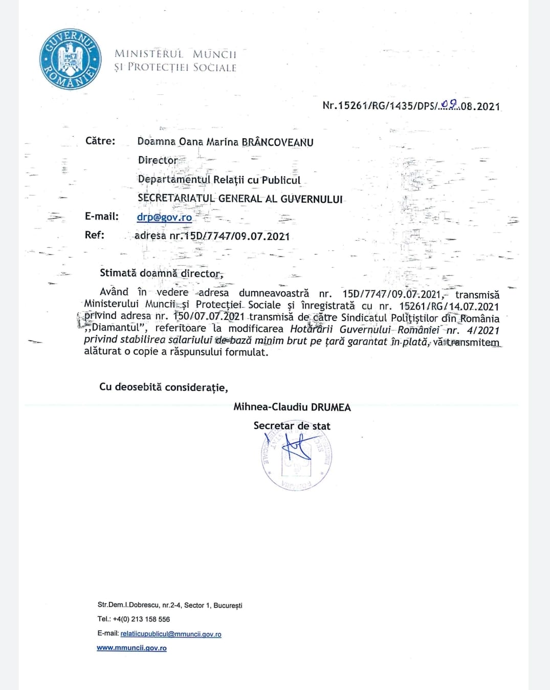 Am solicitat guvernului, alaturi de 100 politisti (activi si pensionari) sa modifice HG 4 din 2021 privind salariul minim garantat in acord cu decizia CCR 51 din 2020/O sa i actionam in judecata/Ceva ce trebuia sa facem inca din 2017